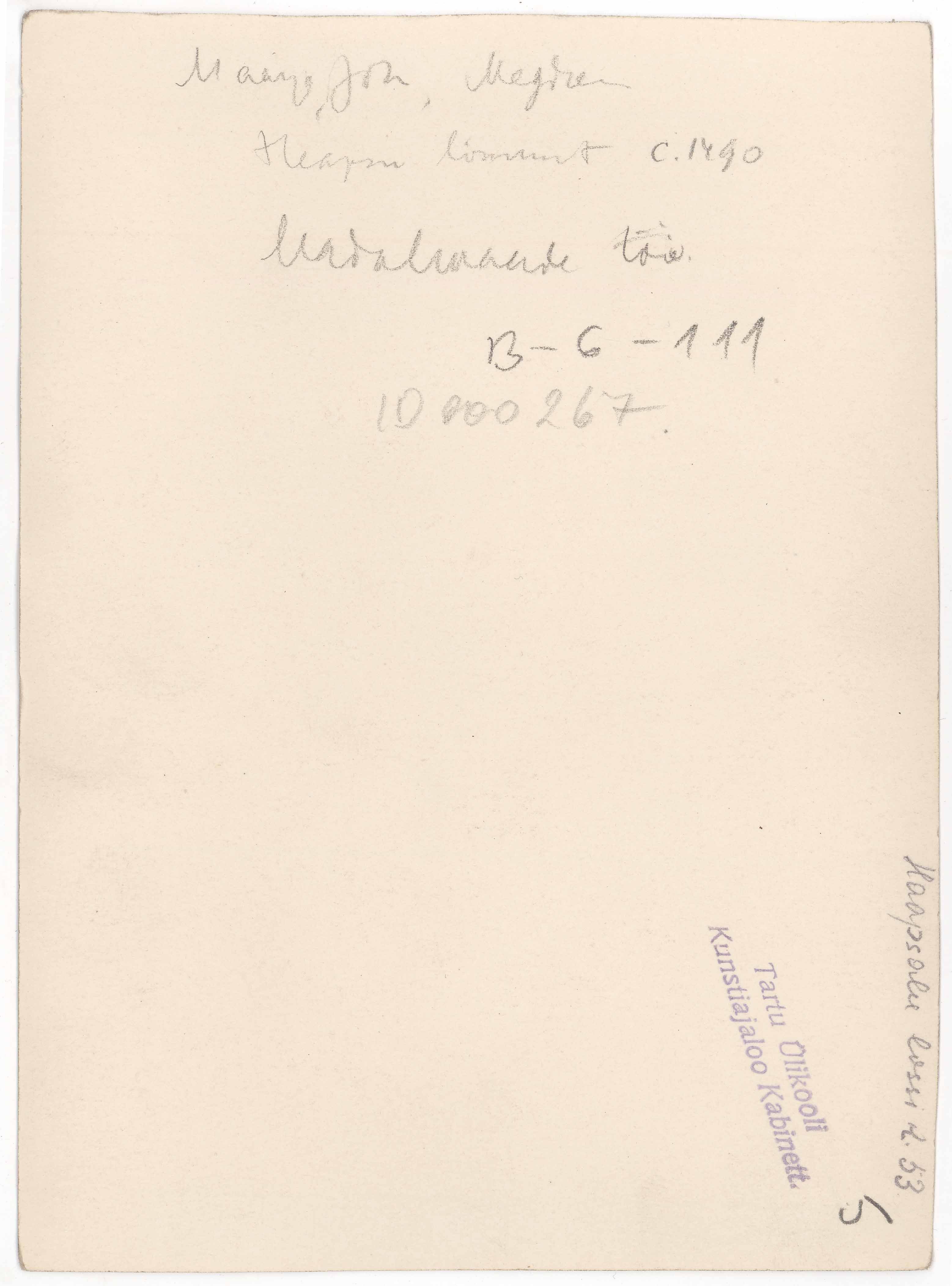 | dc.description | Tekst foto tagaküljel: Haapsalu lossi k. 53. Maarja, Joh, Magdal Haapsa linnusest c. 1490. Madalmaade töö. Tempel: Kabinett | et |