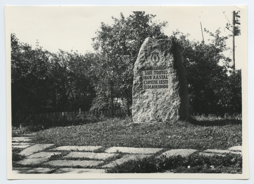 Tartu. Eesti esimese üldlaulupeo (1869) toimumiskoha mälestuskivi Peetri kiriku vastas Leningradi (Narva) maantee ja Puiestee tänava nurgal