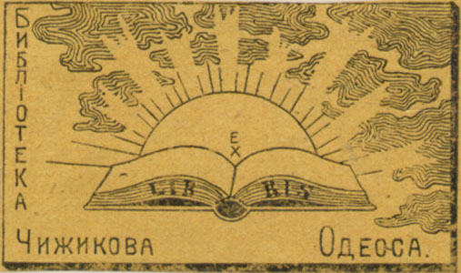 Nelinurkses raamistuses avatud raamat ja tõsusev päike. Joonises all vasakul: ЧИЖИКОВА vasakul: Б / И / Б / Л / I / О / Т / Е / К / А all paremal: ОДЕССА. keskel: E / X / LIB RIS
