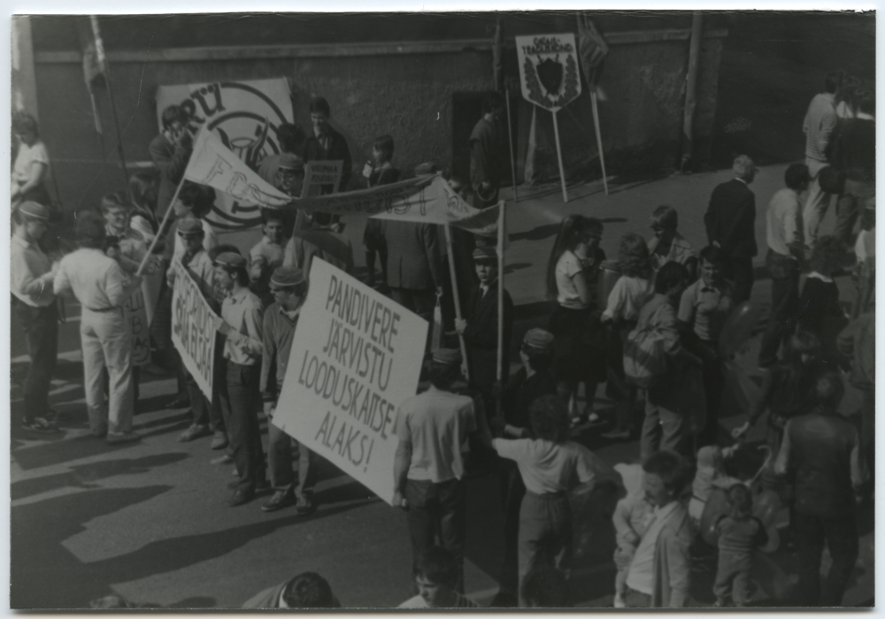 Üliõpilased Tartus Akadeemia tänaval rivistumas 1. mai demonstratsiooniks 1987. a. fosforiidikevadel