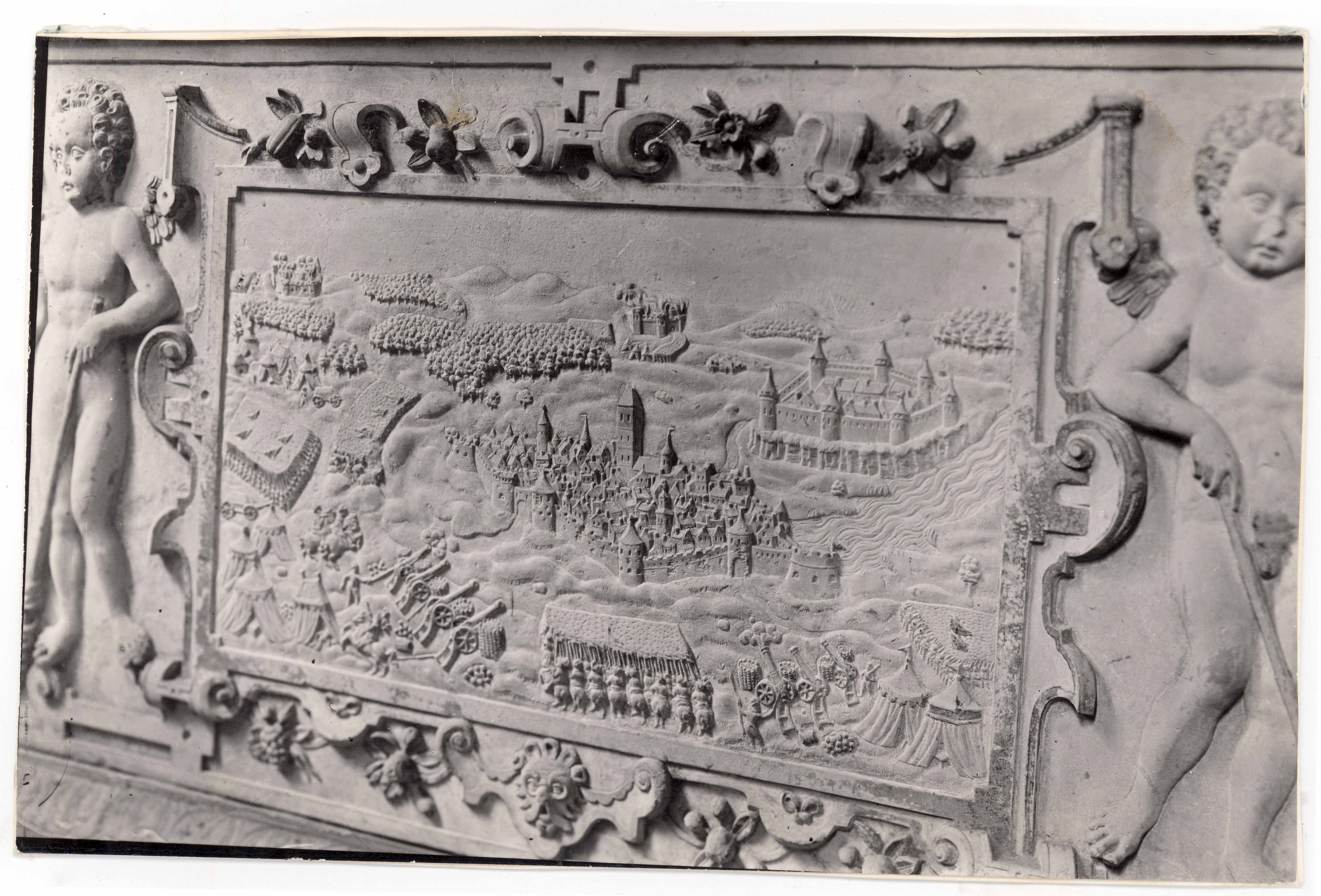 Tallinn. Toomkirik. Pontus de la Gardie hauamonument. Sarkofaag. Eestvaade pöördes. Detail. Narva vallutamise stseen