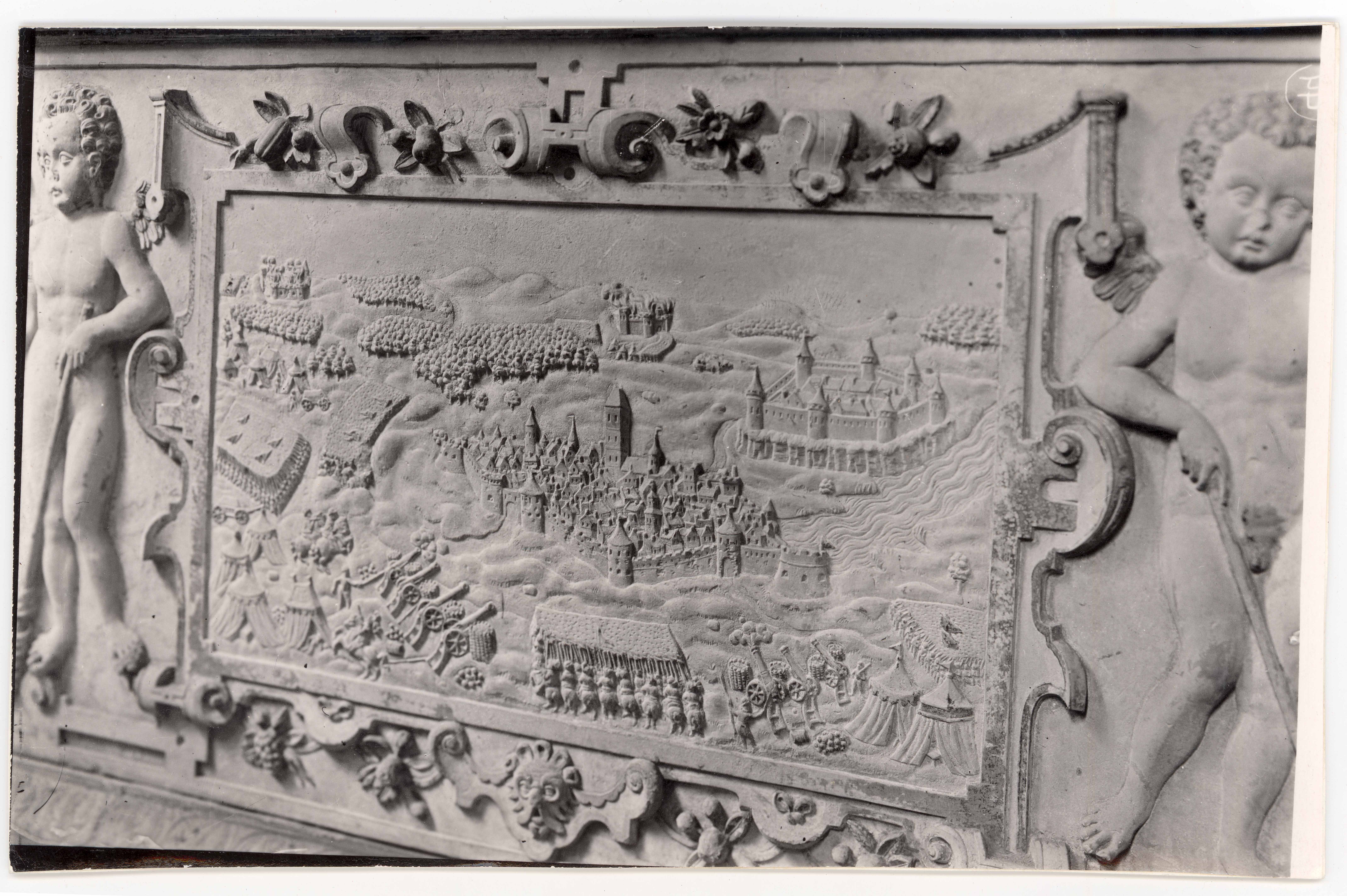 Tallinn. Toomkirik. Pontus de la Gardie hauamonument. Sarkofaag. Eestvaade pöördes. Detail. Narva vallutamise stseen