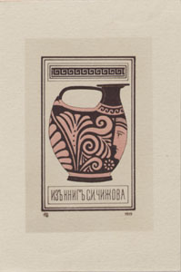 Nelinurkses raamistuses antiikne vaas ornamendi ja naisepeaga, ülal meandermuster. Joonises all signeerig: СЧ 1919 all: ИЗЪ КНИГЪ С. Н. ЧИЖОВА;"Tšižov