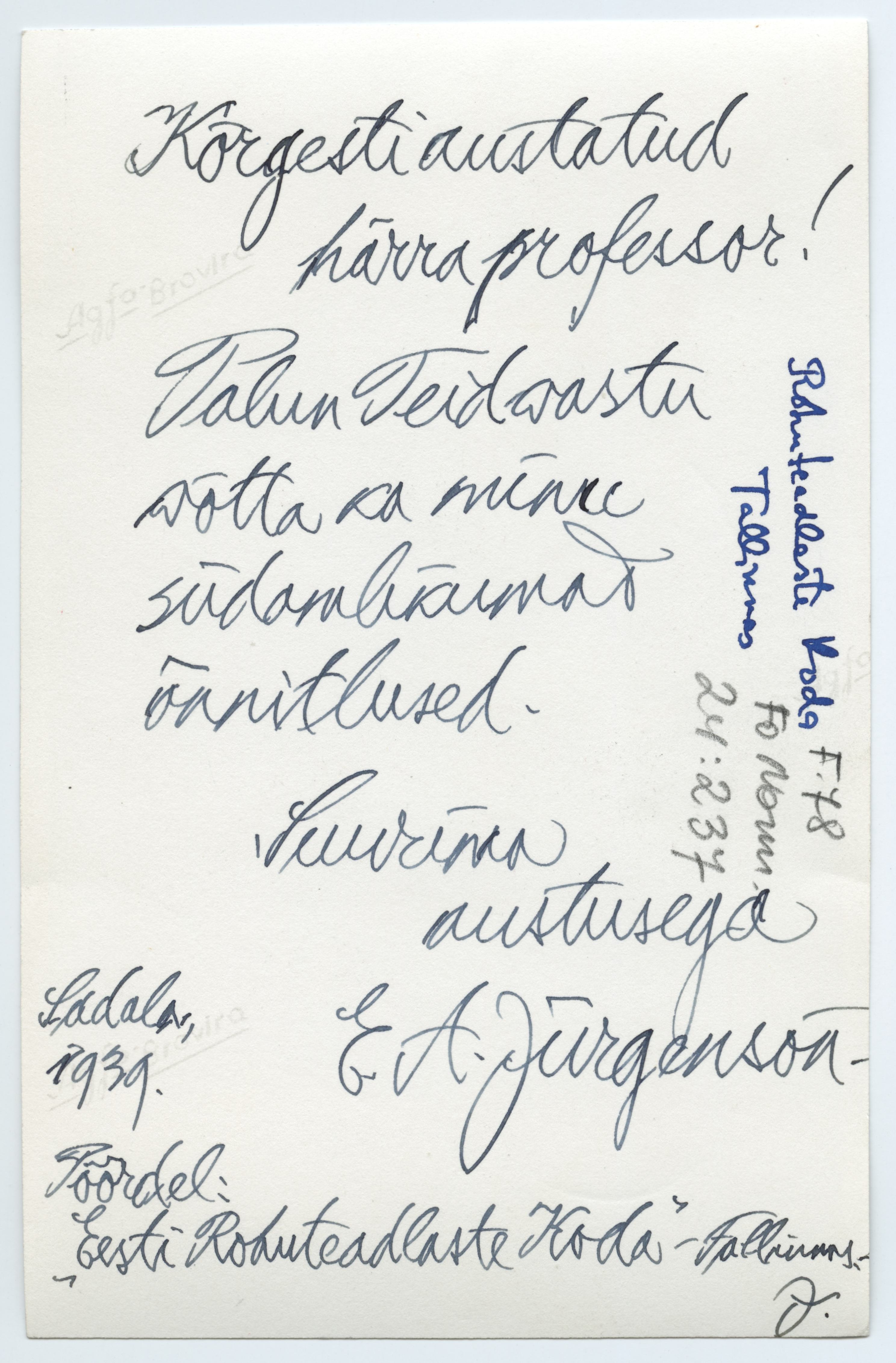 Foto pöördel E. A. Jürgensoni õnnesoov [Herbert Normannile]. Sadala, 1939