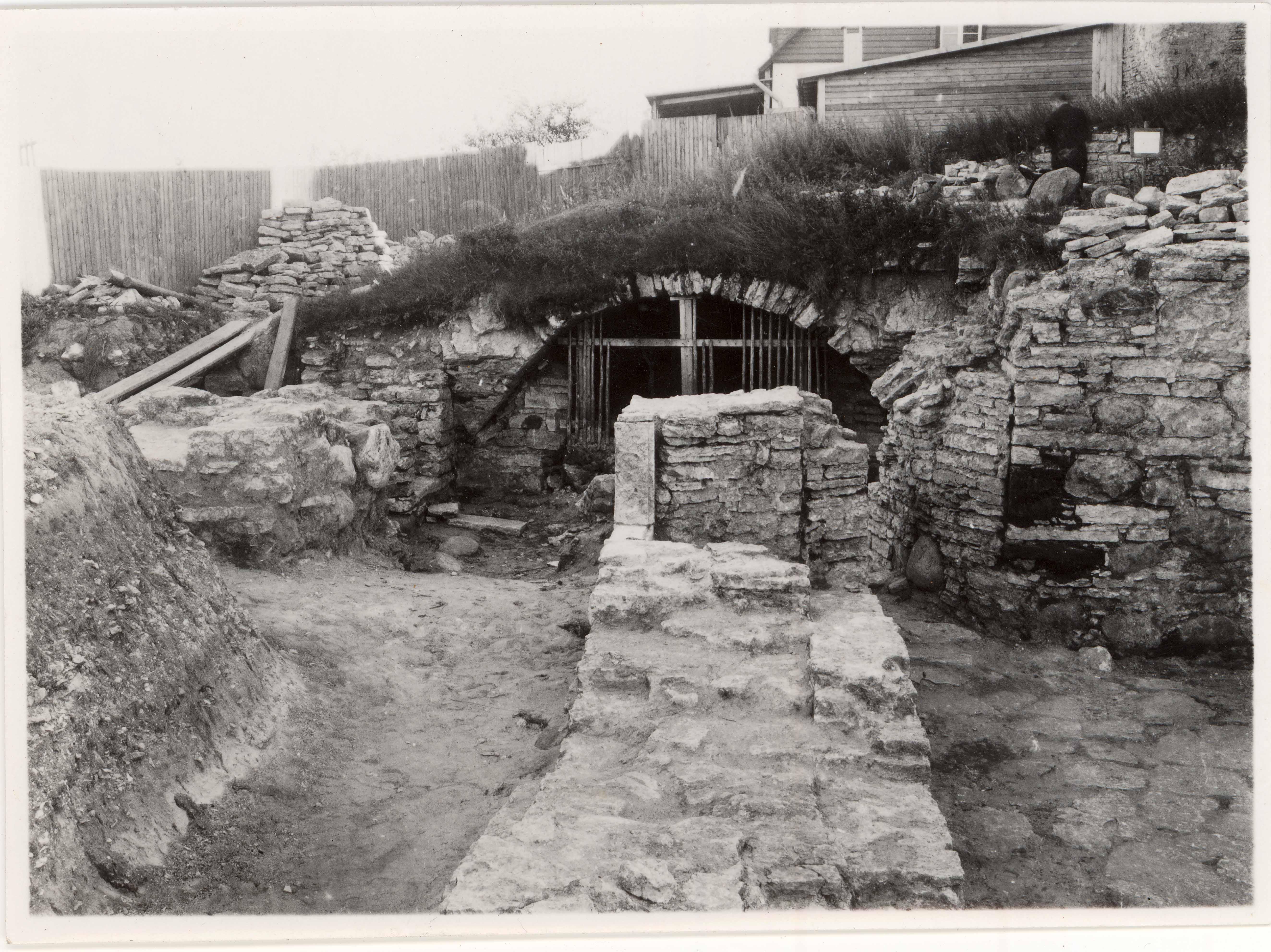 Pirita kloostri idaosa arheoloogilised uurimistööd. Müür võlvitud keldri avause ees. Vaade S-sse