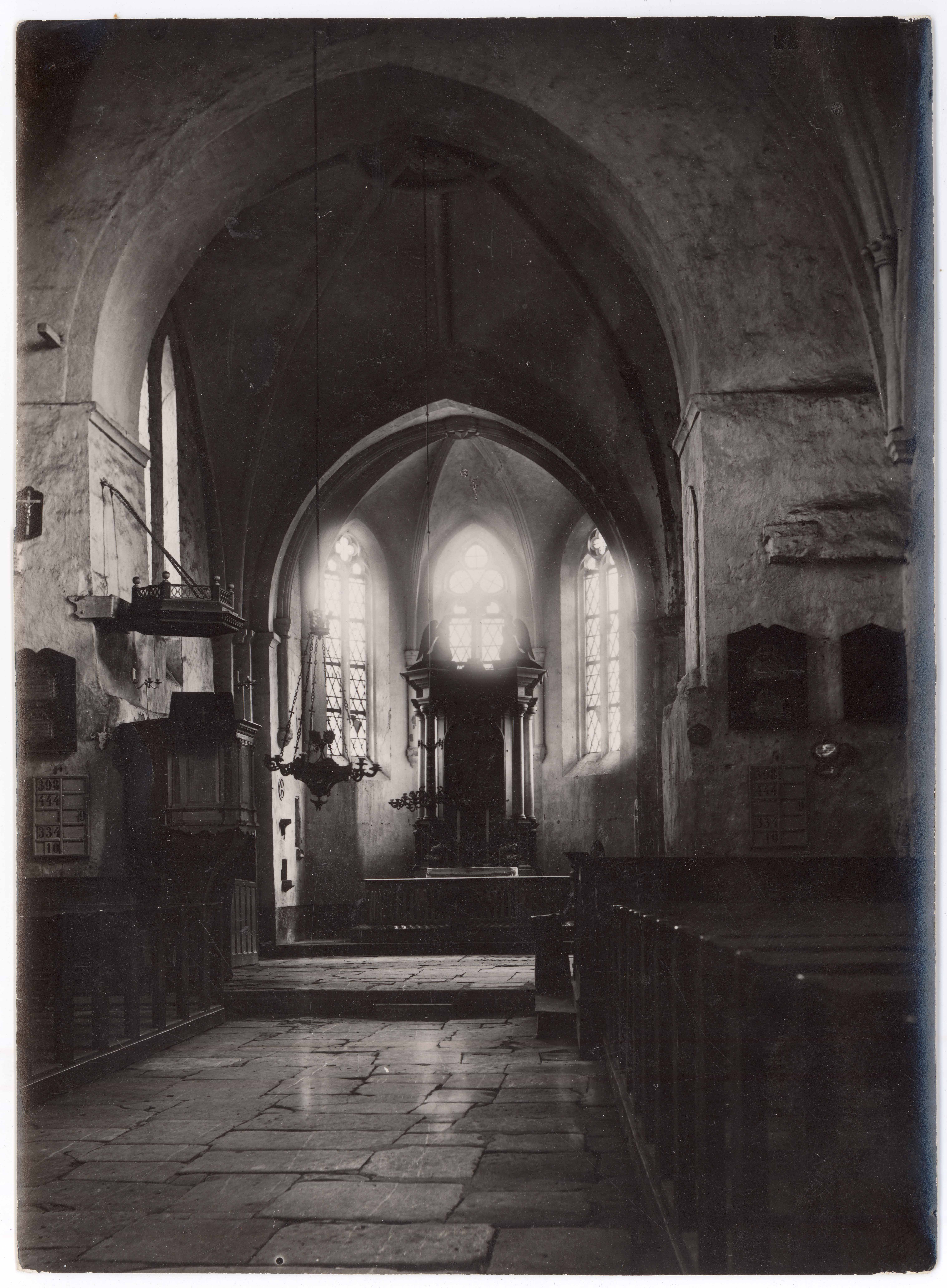 Tekst negatiivi ümbrikul: Valjala. Vaade altariruumi löövist. Foto Arro 1924. Templid: Instituut