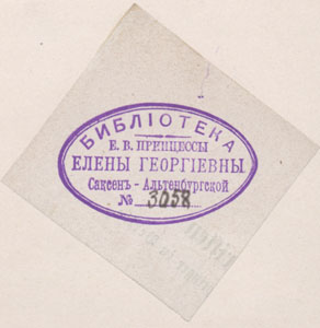 | dc.description | Ovaalis: БИБЛIОТЕКА / Е. В. ПРИНЦЕССЫ / ЕЛЕНЫ ГЕОРГIЕВНЫ / Саксенъ-Алътенбургской / № ... | |