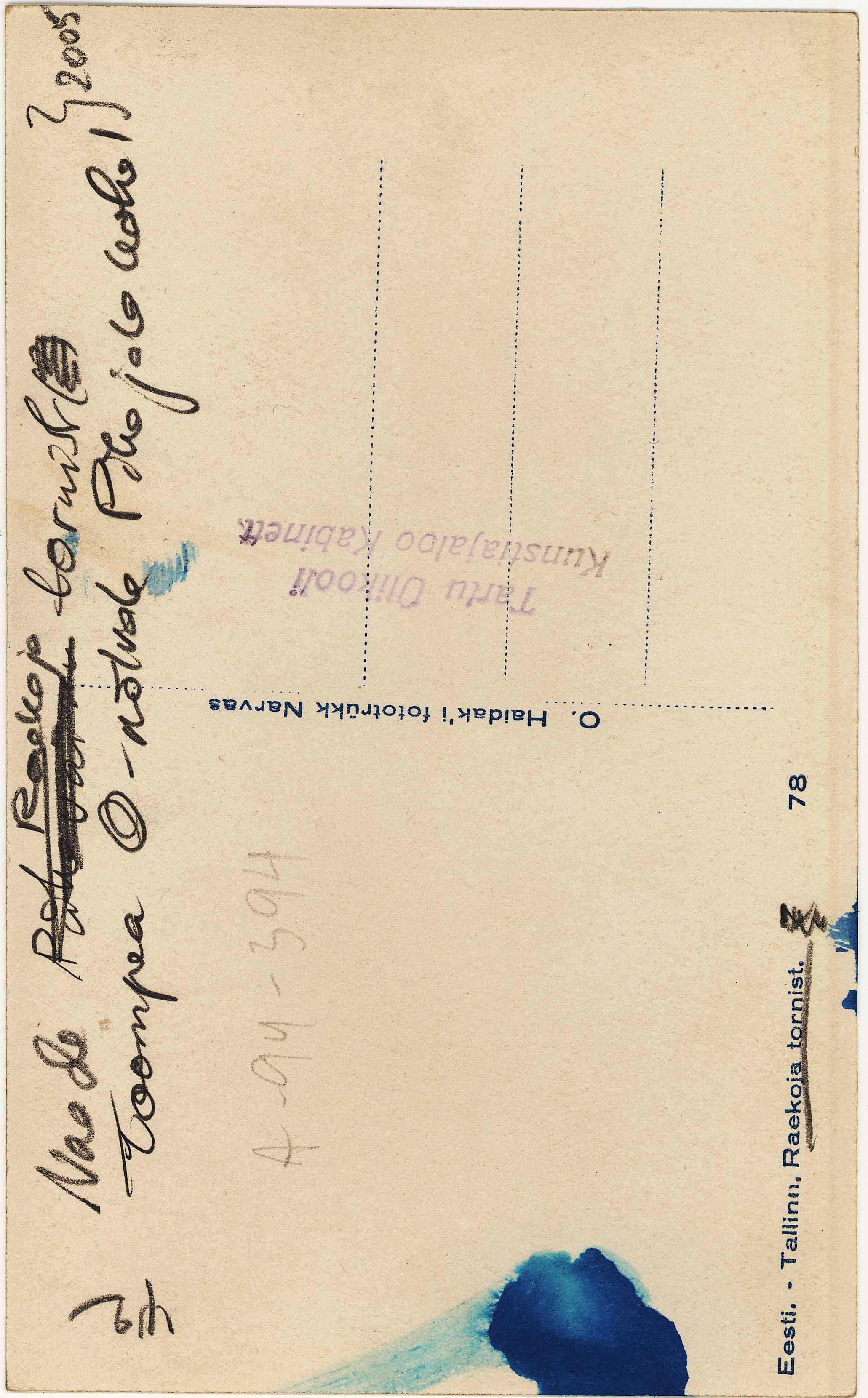 Tekst foto tagaküljel: Eesti.-Tallinn, Raekoja tornist. O. Haidak'i fototrükk Narvas. Tempel: Kabinett