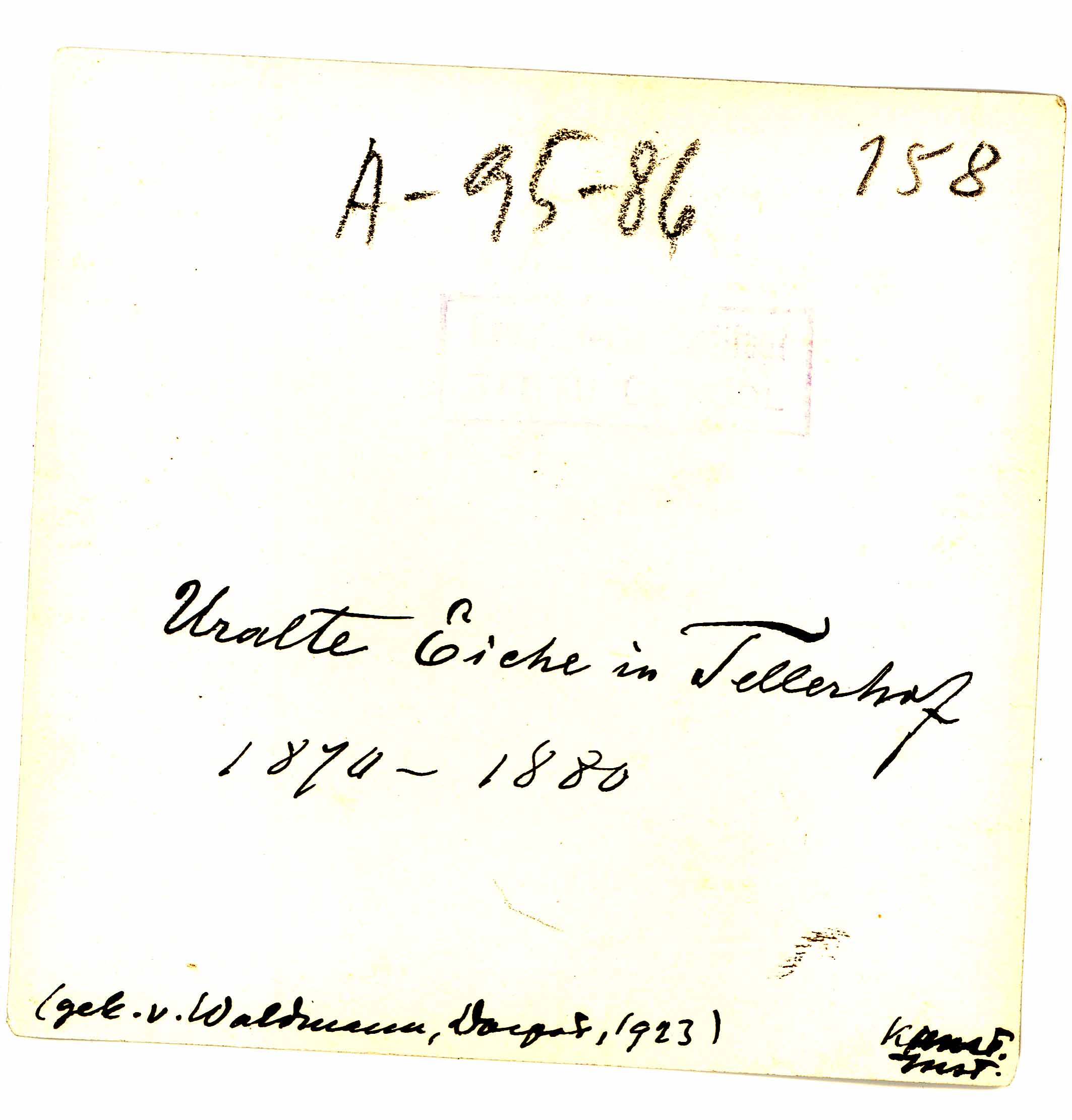 Tekst foto tagaküljel: Uralte Eiche in Tellerhof. 1870-1880. (gek v Waldmann, Dorpat, 1923) Kunst. Inst. Tempel: Instituut