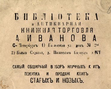 | dc.description | Lehel: БИБЛIОТЕКА / И АНТИКВАРНАЯ / КНИЖНАЯ ТОРГОВЛЯ / А. ИВАНОВА / С-Петербургъ 1) Казанскaя ул. домъ № 28 / [---] | |