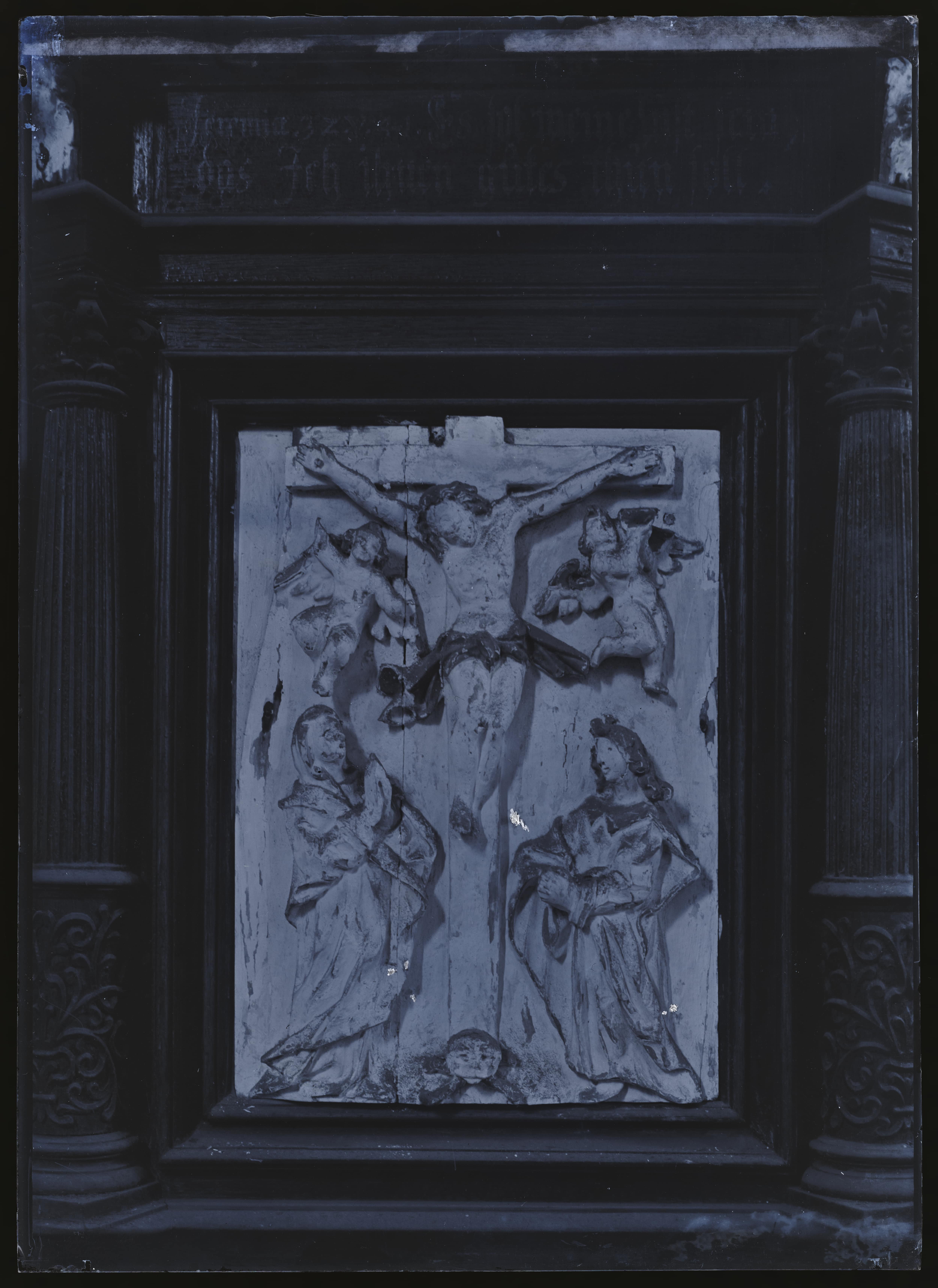 Kaarma Peetri ja Pauli kirik. Kantsel (17-19. saj). Korpus (1645). Külgreljeef stseeniga Kristuse elust: Kristus ristil