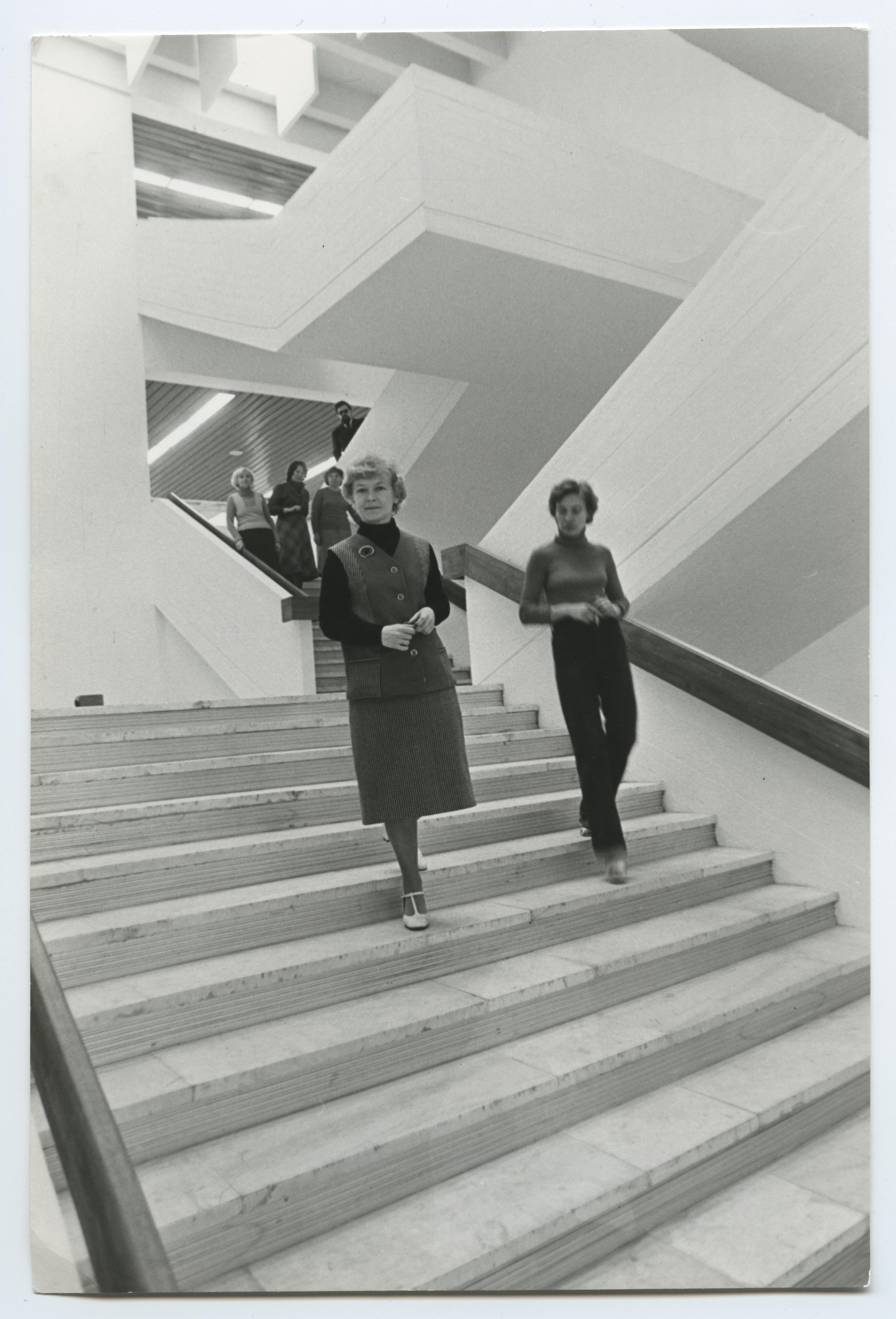 1C: Ehitustrusti juhataja Lauri Schmidt (vasakul) annab TÜ rektorile Arnold Koobile üle raamatukogu suure sümboolse puust võtme. Vasakul paremalt 1. EKP Tartu Linnakomitee 1. sekretär Indrek Toome jt, paremal vasakult: 1. TÜ raamatukogu direktor Laine Peep, 2. Eesti NSV kõrg- ja keskerihariduse minister Ilmar Nuut, 3. Advig Kiris, 4. Helve Kabur, 5. TÜ õppeprorektor Uno Palm; 1B-a: Arnold Koop näitab sümboolset võtit. Taga vasakul Laine Peep, paremal Helve Kabur jt; 2C: Arnold Koop annab sümboolse võtme üle Laine Peebule. Vasakult 3. Indrek Toome, 4. EKP Keskkomitee 1. sekretär Karl Vaino (poolikult), 5. Arnold Koop, 6. Laine Peep, 7. Ilmar Nuut, 8. Advig Kiris, 9. Helve Kabur, 10. Eesti NSV kõrg- ja keskerihariduse ministri asetäitja Kaljo Rink; 3B: Raamatukogu direktor Laine Peep tutvustab uut hoonet. Ees vasakult: Eesti NSV Ministrite Nõukogu esimehe asetäitja Arnold Green, Karl Vaino, Laine Peep, Indrek Toome, Ilmar Nuut, kaks tundmatut, Helve Kabur, TÜ haldusprorektor Ain Otstavel; 5C: Uue hoone peatrepp; 6B: Uue hoone peatrepp. Trepil esiplaanil TÜ raamatukogu teadusdirektor Urve Tõnnov (vasakul) ja teadussekretär Malle Ermel, taga (vasakult) Elna Hansson, Imbi Pelkonen ja Mare Rand; 7B: Uue hoone peatrepp