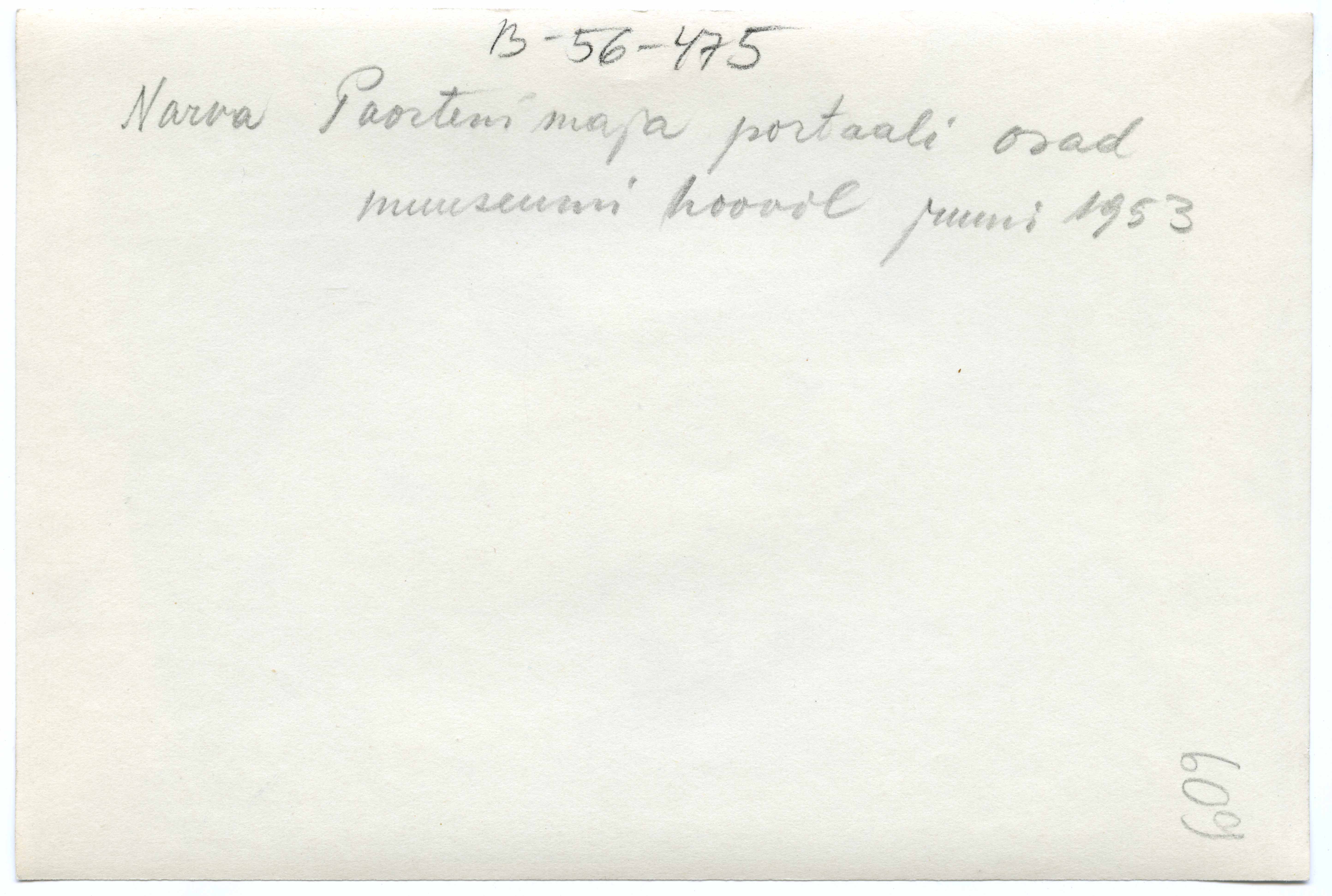 Tekst foto tagaküljel: Narva Poorteni maja portaali osad muuseumi hoovil juuni 1953