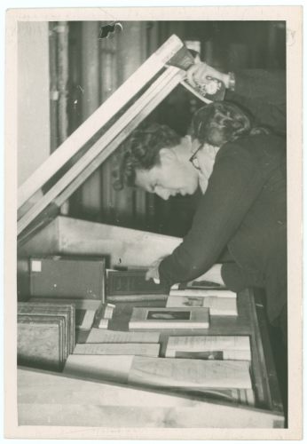 Vambola Maavara TÜ raamatukogus Charles Darwini näitust üles panemas 1959. a.