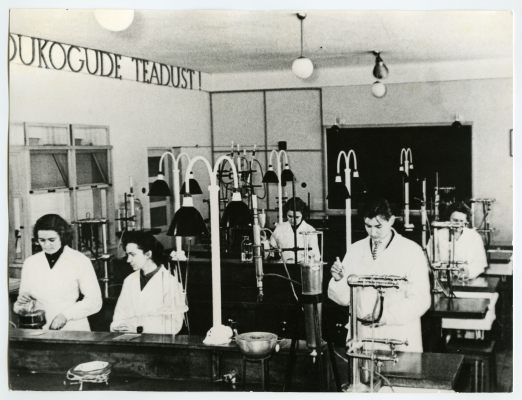 Tartu ülikooli üliõpilased farmaatsia kateedris laboratoorsel tööl 1960. a.