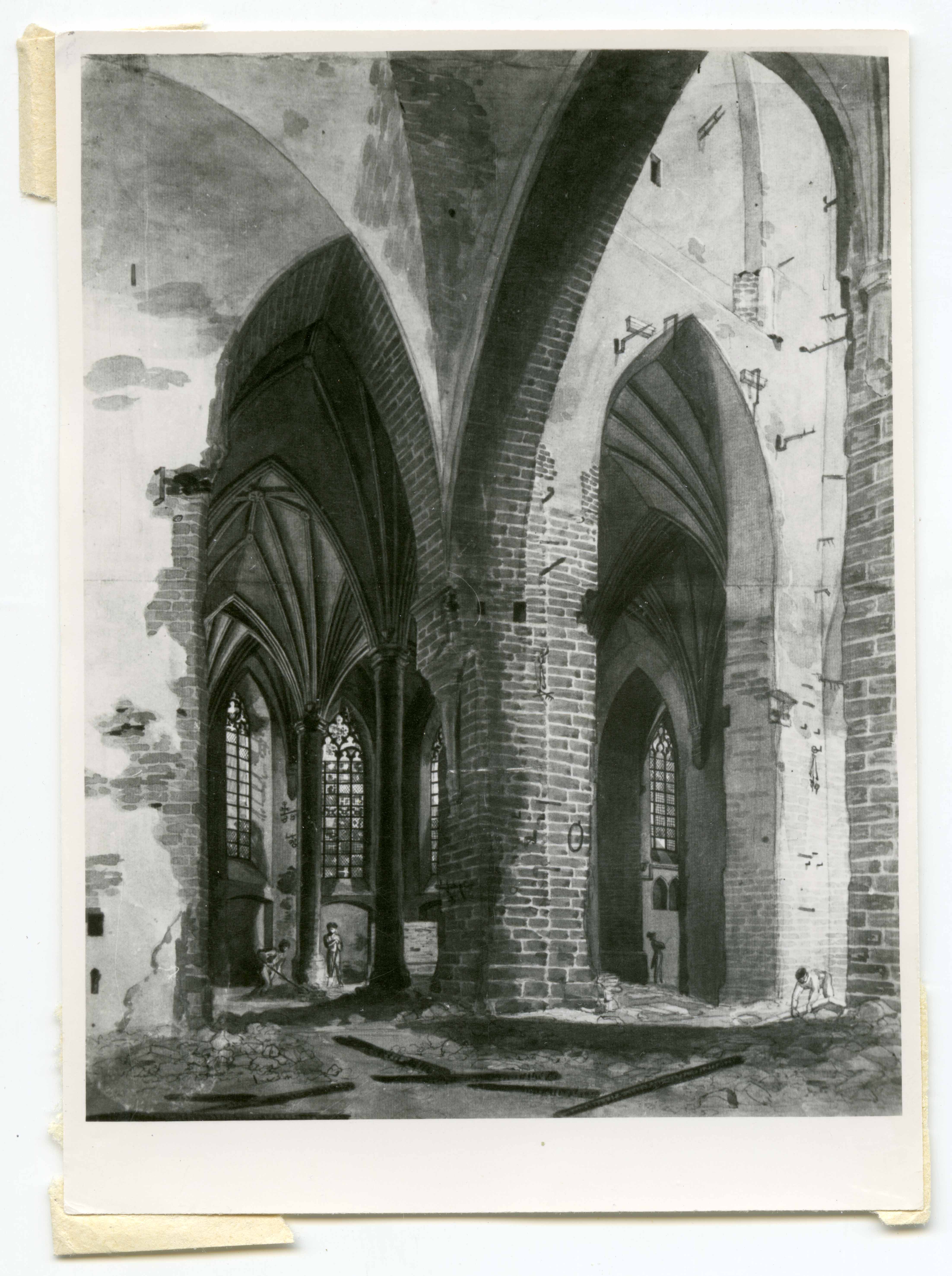 Tallinn. All-linn. Oleviste kirik. Vaade N-löövist koori poole SW-sse pärast põlemist 16. juunil 1820. K. Walther. Joonistus. 1821