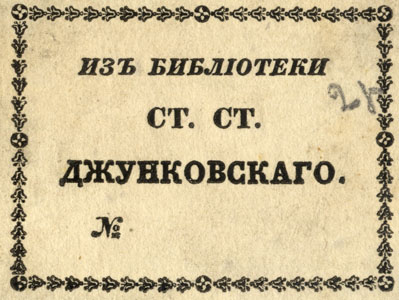 Mustas nelinurkses ornamenteeritud raamistuses: ИЗЪ БИБЛIОТЕКИ / СТ. СТ. / ДЖУКОВСКАГО. / №