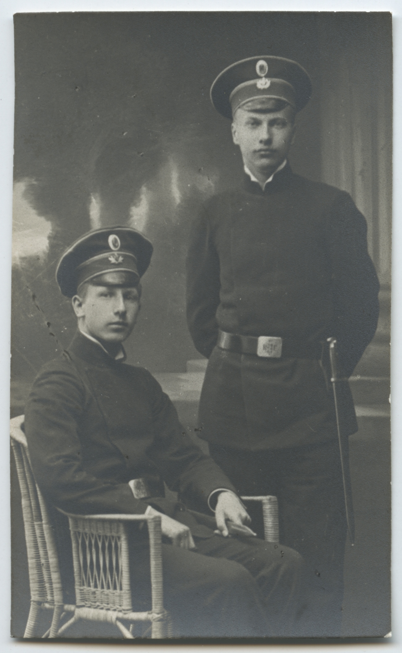 Theodor Kima (vasakul) ja Herbert Normann Tartu Aleksandri Gümnaasiumi õpilase vormis sõjaväekutse-eelse ettevalmistuse ajal. Kaksikportree