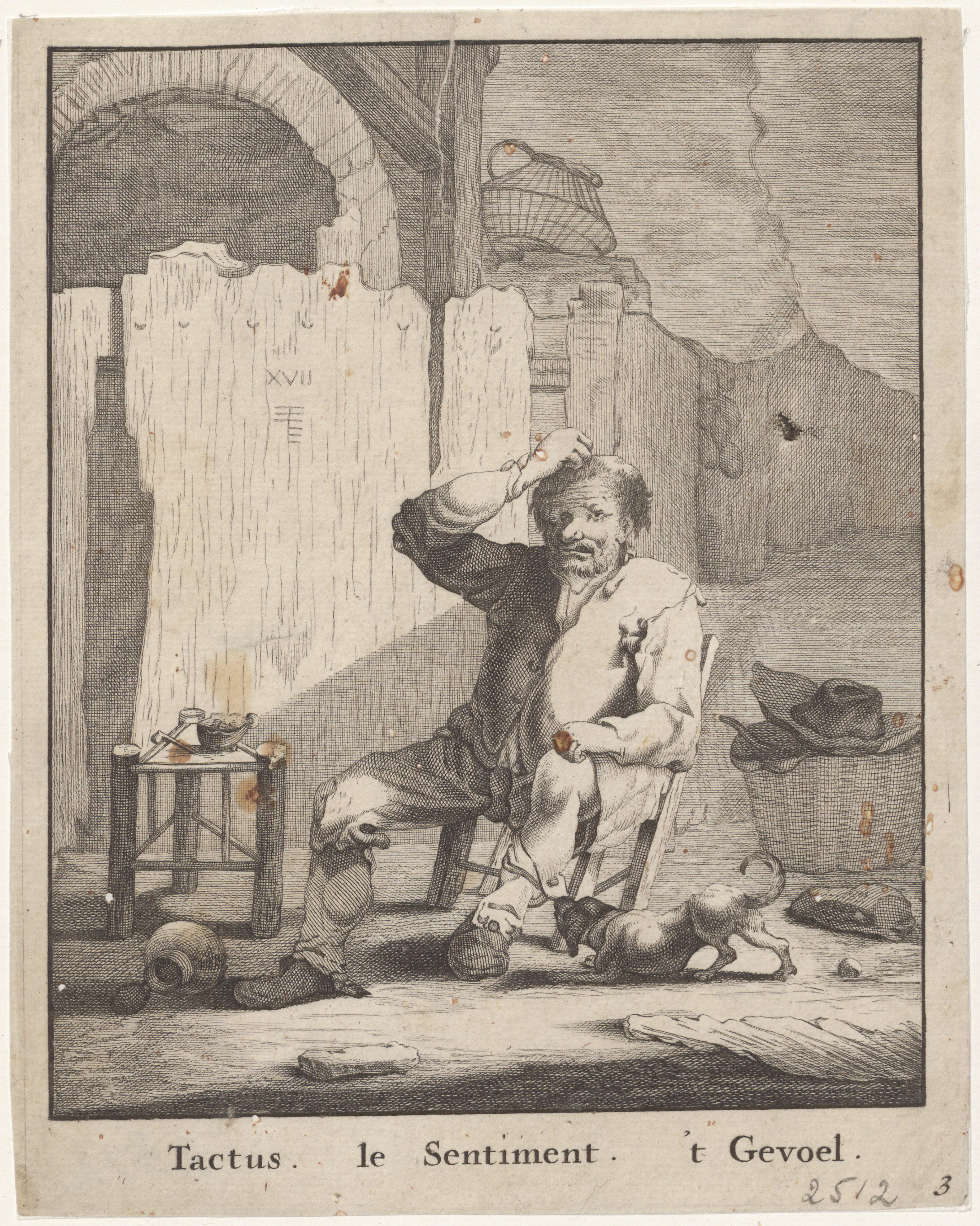 Räbalais mees istumas puust toolil, katsumas muhku oma peas, koer püksisäärt sikutamas. - All: Tactus. le Sentiment. 't Gevoel.