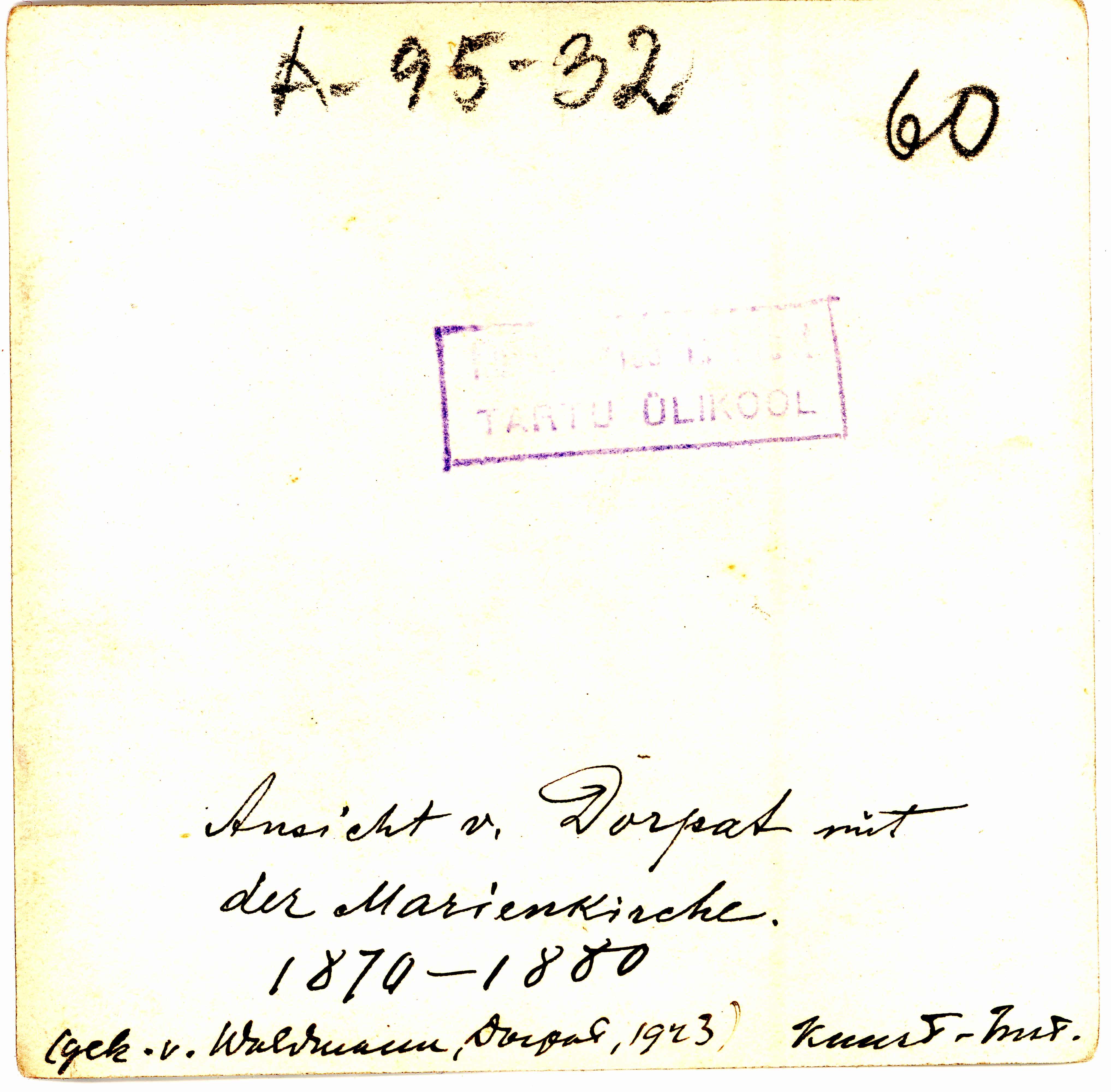 Tekst foto tagaküljel: Ansicht v. Dorpat mit der Marienkirche. 1870-1880. (gek v Waldmann, Dorpat, 1923) Kunst. Inst. Tempel: Instituut