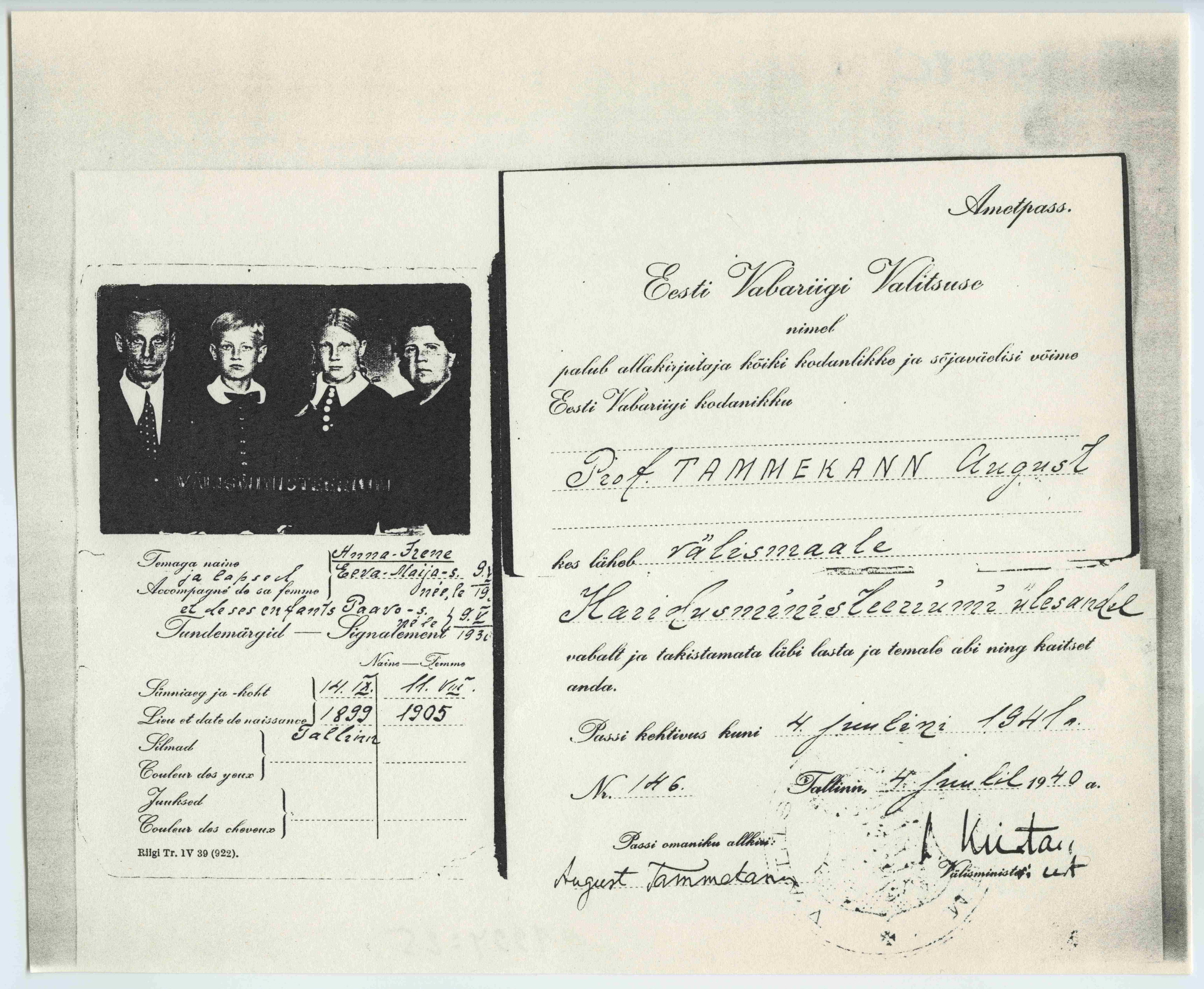August Tammekannule Tallinnas 4. juulil 1940. a. välismaale sõiduks välja antud ametipass tema perekonnafotoga