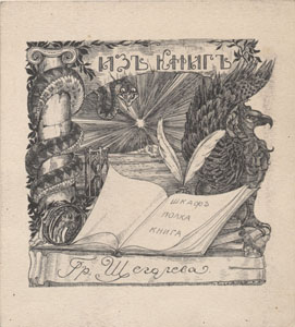 Esiplaanil vasakul ümber joonia samba väändunud madu, paremal kotkas profiilis, all avatud raamat ja tindipott kahe hanesulega, tagaplaanil avar maastik särava päikesega. Joonises all paremal signeering: П. Сивковъ all keskel: Гр. Щеголева ülal: ИЗЪ КНИГЪ keskel avatud raamatus: ШКАФЪ / ПОЛКА / КНИГА