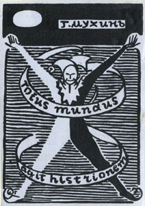 Viirutatud taustal välja sirutatud käte ja jalgadega narr. Joonises ülal keskel: Т. Мухинъ keskel lindil: Totus mundus / agit histrionem