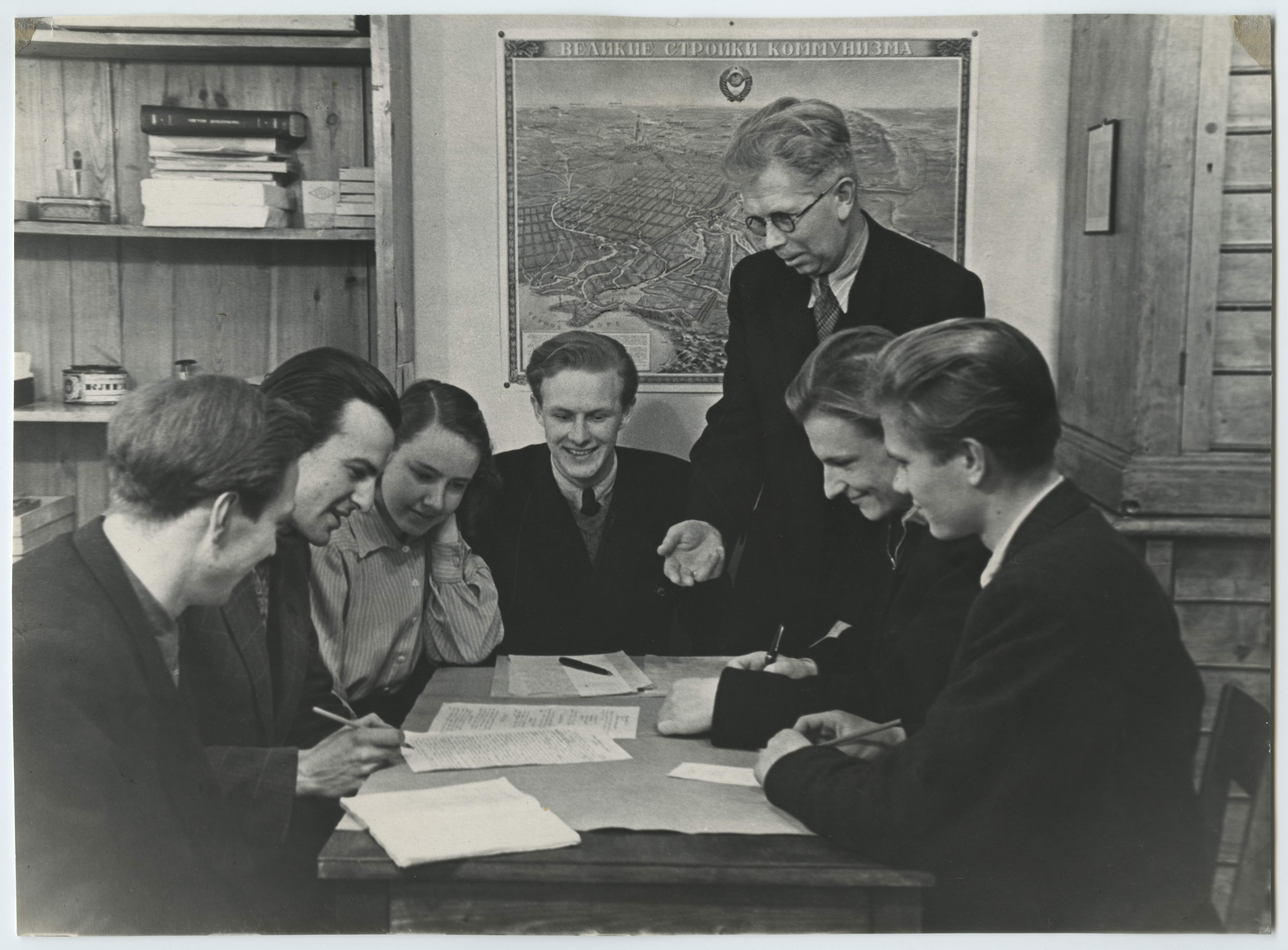Tartu ülikooli Üliõpilaste Teadusliku Ühingu (ÜTÜ) geoloogiaringi liikmed arutamas Vilniusest saabunud kirja seoses ÜTÜ teaduskonverentsiga 1952. aasta kevadel