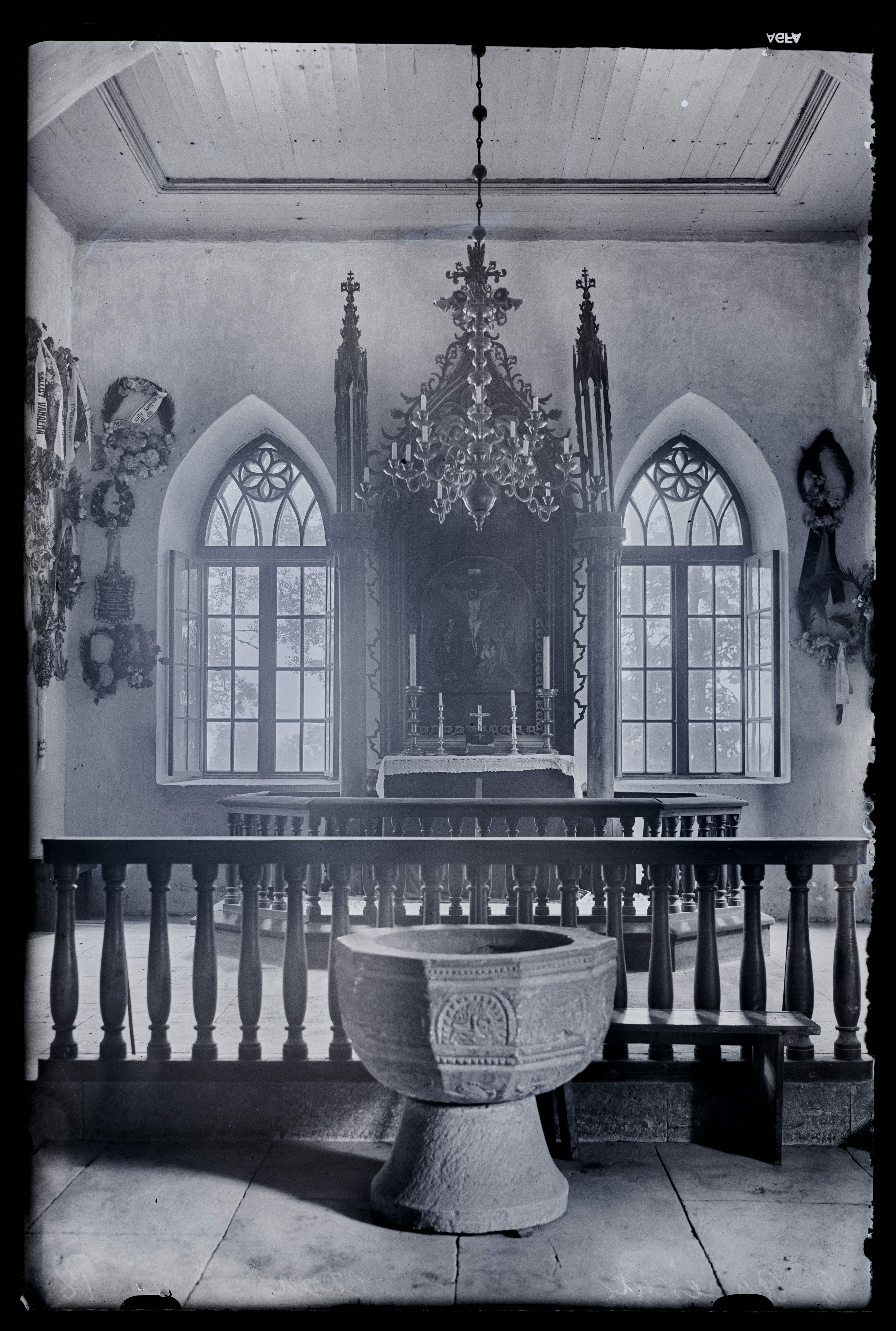 Tekst negatiivi ümbrikul: Anseküla kirik. Altar. Koos ristimiskiviga. Tempel: Kalamees 1931