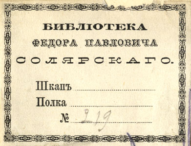 Nelinurkses ornamenteeritud raamistuses: БИБЛIОТЕКА / ФЕДОРА ПАВЛОВИЧА / СОЛЯРСКАГО. / Шкапъ / Полка / №