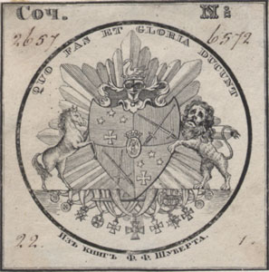 Nelinurkses raamistuses sõõr, sõõris vapp lõvi ja hobusega. Joonises all keskel: ИЗЪ КНИГЪ Ф. Ф. ШУБЕРТА. ülal deviis: QUO FAS ET GLORIA DUCUNT ülal vasakul: Соч. paremal: №